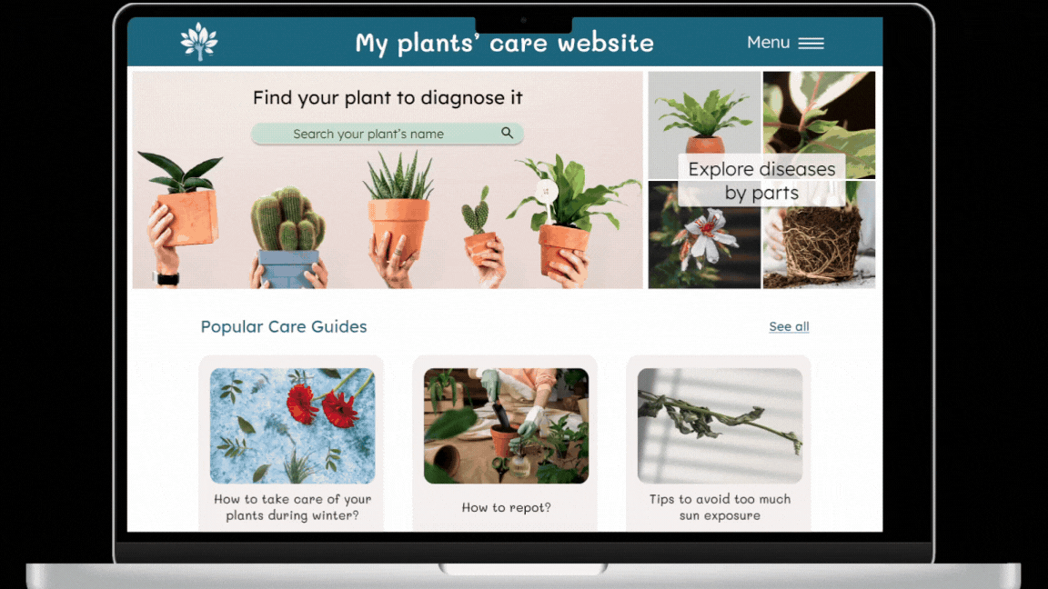 Projet, réalisé en anglais, dans le cadre de la certification Google UX Design en tant qu’UX-UI Designer. L’objectif était de maquetter un site web responsive pour l’entretien des plantes intérieures (pouvoir les diagnostiquer et avoir un plan d’actions pour les soigner). Étant donné qu’il s’agissait d’un projet où il n’y avait aucun existant, j’ai également dû penser à l’image de marque et à la personnalité de ce site web responsive.